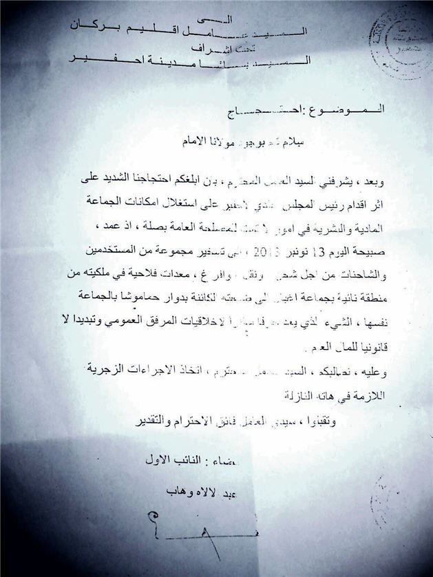 بعد البيان الاول الدي أصدرته الأقلية داخل المجلس البلدي لأحفير، و بعد امتناعهم عن التصويت عن ميزانية 2014 و التي رفضت في الدورة الاستثنائية، اليوم وجهت المجموعة الستة(6) رسالة احتجاج الى السيد عامل اقليم بركان و باشا مدينة أحفير حول الخروقات التي يقوم بها رئيس المجلس البلدي ميمون منصوري حيت أنه صباح يوم 13 نونبر 2013 قام بتسخير مجموعة من المستخدمين و الشاحنات من أجل شحن و نقل و إفراغ معدات فلاحية في ملكيته من منطقة نائية بجماعة أغبال الى ضيعته الكائنة بدوار حماموشن بالجماعة نفسها، و استغلال امكانيات الجماعة المادية و البشرية في أمور لا تمت المصلحة العامة بصلة- هدا ما جاء في الرسالة الموجهة الى السيد العامل-