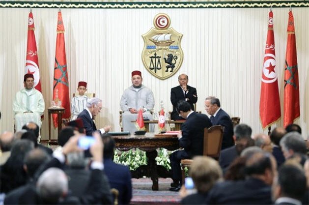 أشرف رئيس الجمهورية التونسية وملك المغرب مساء الجمعة بقصر الرئاسة بقرطاج على موكب توقيع 23 اتفاقية ومذكرة تفاهم وبرامج تنفيذية للتعاون بين البلدين