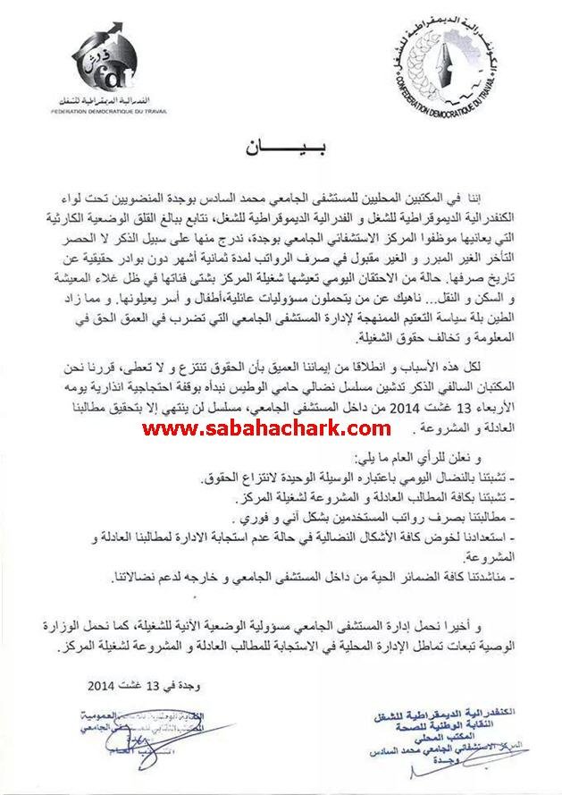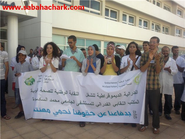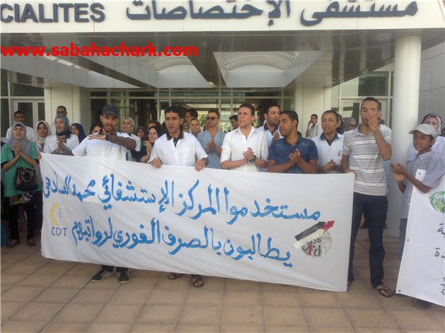 التأم مستخدمو المركز الاستشفائي محمد السادس بوجدة صبيحة يوم الأربعاء 13 غشت 2014 ابتداء من الساعة التاسعة صباحا من داخل المستشفى الجامعي في وقفة احتجاجية للمطالبة بصرف فوري لرواتبهم .