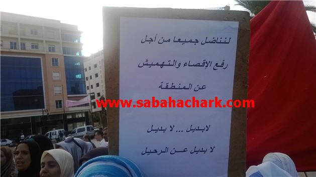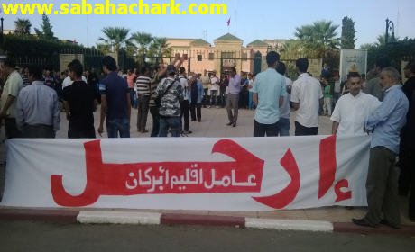 هذا الوضع أدى إلى تنظيم هذه الوقفة الاحتجاجية , حيث رفعت شعارات تطالب برحيل عامل إقليم بركان : “العامل إرحل ” , وتعالت حناجر المحتجين مطالبين بمحاسبة عامل إقليم مرددين كلمات من قبيل : ” العامل سير فحالك … بركان ماشي ديالك ” “ يا عامل يا مسؤول هاذ الشي ماشي معقول … الإضراب سيكون لازم الحق يكون “….