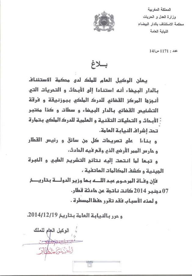 وجاء في بلاغ للنيابة العامة بمحكمة الاستئناف بالدار البيضاء أنه “استناد إلى الابحاث والتحريات التي أنجزها المركز القضائي للدرك الملكي ببوزنيقة، وفرقة التشخيص القضائي بالدار البيضاء وسطات، وكذا مختبر الأبحاث والتحليلات التقنية والعليمة للدرك الملكي بتمارة، تحت إشراف النيابة العامة، وبناء على تصريحات كل من السائق ورئيس القطار وحارس الممر الأرضي الذي وقع فيه الحادث، وتبعا لما انتهت اليه نتائج التشريح الطبي والخبرة الجينية، وكشف المكالمات الهاتفية، فإن وفاة المرحوم عبد الله بها وزير الدولة بتاريخ 7 دجنبر 2014 كانت ناتجة عن حادثة قطار .