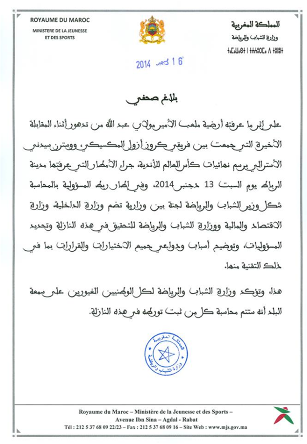 وأخيرا أصدرت وزارة الشباب والرياضة بلاغا رسميا حول الشوهة التي عرفتها أرضية ملعب مولاي عبد الله بالرباط . في البلاغ