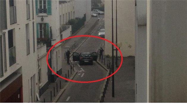 وفي أحد الاشرطة التي صورت من سطح منزل مجاور، بالإمكان مشاهدة شخصين من أصل ثلاثة مجهزين عسكريا بشكل مميز: اللباس أسود، الوجه ملثم، أحذية رياضية، جعب لمخازن الرصاص قد تخفي أيضا سترات واقية من الرصاص. وبينما كانا يغادران المكان شاهدا شرطيا على دراجة هوائية فنزلا من السيارة وأطلقا النار عليه بدم بارد وطلقة طلقة. بعدها اقترب أحدهما منه وأجهز عليه برصاصة في الرأس وهو ممدد أرضا بعد إصابته. وبعد أن تأكدا من عدم وجود شرطي آخر في المكان صعدا إلى السيارة من دون هرولة .