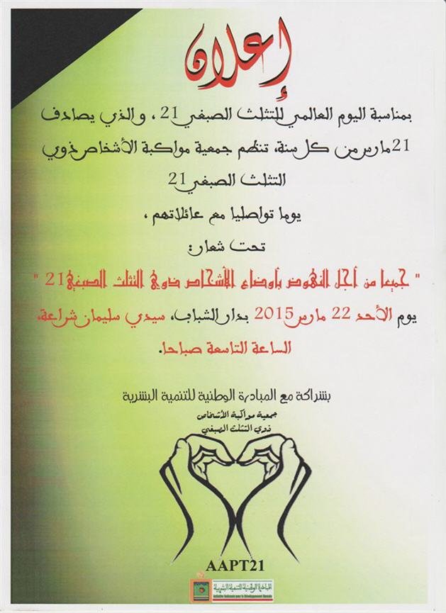 بمناسبة اليوم العالمي للتثلث الصبغي21 ، والذي يصادف 21 مارس من كل سنة ، تنظم جمعية مواكبة الأشخاص ذوي التثلث الصبغي 21 يوما تواصليا مع عائلاتهم ، تحت شعار ” ” جميعا من أجل النهوض بأوضاع