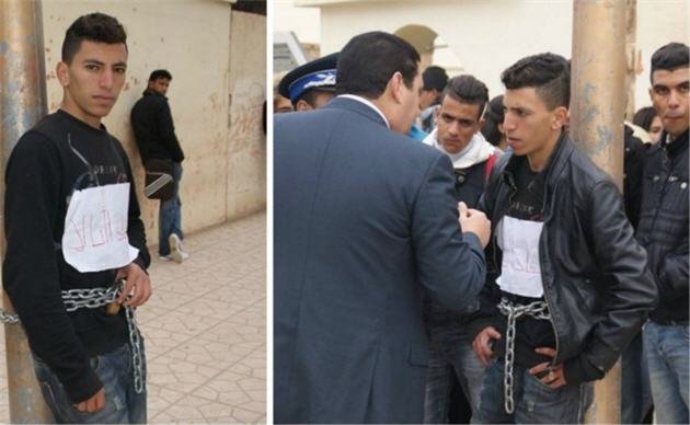 أقدم شاب مفصول عن الدراسة بمدينة تاوريرت صباح اليوم السبت على تكبيل نفسه بسلاسل حديدية أمام ثانوية الفتح التأهيلية حيث كان يتابع دراسته الثانوية ، بعدما تم رفض قبول طلب الإستعطاف الذي تقدم به لدى إدارة المؤسسة من أجل العودة الى فصول الدراسة. و فوجئ مجموعة من المواطنين في مدينة تاوريرت بتواجد الشاب مربوط بسلاسل حديدية في عمود كهربائي ليتساءل الجميع حول السبب قبل أن يكتشف أن الأمر يتعلق باحتجاج التلميذ عن عدم الإستجابة لطلبه المتمثل في العودة للتحصيل بأقسام الثانوية خاصة وأنه مقبل على امتحانات شهادة الباكلوريا. مجموعة من شهود العيان اعتبروا أن المؤسسة قبلت مجموعة من الطلبات الإستعطافية التي تقدم بها مجموعة من التلاميذ في حين تم رفض طلب التلميذ المحتج حيث اعتبروا أن القانون يخول لأي تلميذ راسب لمدة سنتين سواء في السنة الأولى بكالوريا أو الثانية بكالوريا التقدم بطلب الإستعطاف لإتمام دراسته بإضافة سنة كفرصة أخيرة للتلميذ من أجل تجاوز هذه المرحلة التعليمية.