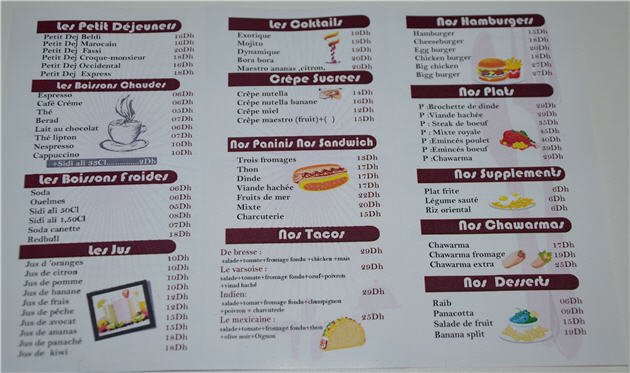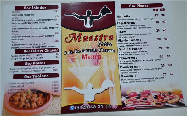 مقهى ومطعم « مايسترو » تقدم لزبنائها خدمات بمستوى وجودة عالية، بقائمة تضم أنواعا عديدة من المأكولات والمشروبات، حسب الطلب، كما تسعى إلى تحديد أثمنة جد مناسبة وعروض مغرية لفائدة زبنائها من عشاق الذوق الرفيع والجودة العالية.