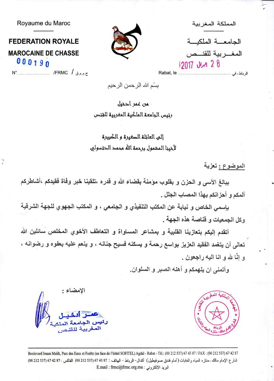 وبهذه المناسبة الأليمة يتقدم رئيس الجامعة الملكية المغربية للقفص، بإسمي الخاص و نيابة عن المكتب التنفيذي و الجامعي ، و المكتب الجهوي للجهة الشرقية وكل الجمعيات و قناصة هذه الجهة ،بأحر التعازي لعائلة تسولي الصغيرة والكبيرة، سائلين من الله عز وجل أن يتغمد الفقيد بواسع رحمته، ويسكنه فسيح جناته، ويلهم ذويه الصبر والسلوان، إنا لله وإنا إليه راجعون.