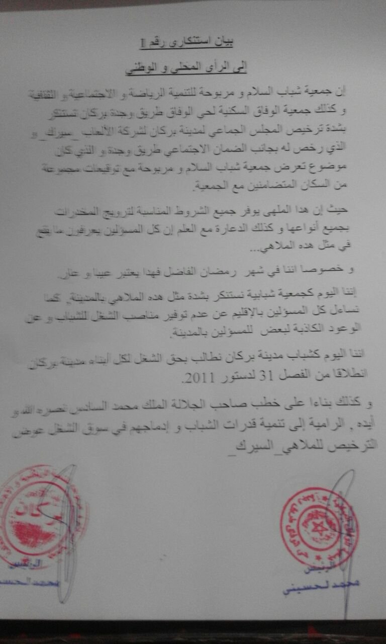 أصدرت جمعية شباب السلام و مربوحة للتنمية الرياضية و الاجتماعية و الثقافية وجمعية الوفاق السكنية لحي الوفاق طريق وجدة، بيانا استنكاريا، توصلت جريدة صباح الشرق بنسخة منه، يخص ترخيص المجلس الجماعي لمدينة بركان لشركة الألعاب لنصب سيرك بالساحة المجاورة لمقر الضمان الاجتماعي، حيث سبق لهاتين الجمعيتين أن تقدمتا بتعرض في هذا الشأن معززا بتوقيعات الساكنة، ويعزى هذا التعرض حسب ما استقته جريدتنا من ممثلي الجمعيتين كون أن هذا السيرك أو الملهى يوفر الظروف لترويج المخدرات بشتى أنواعها والتعاطي للدعارة، وهذا ما يتضمنه أيضا و يزكيه البيان 1 وهذا نصه:
