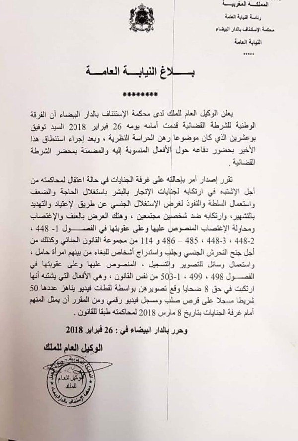 قرر الوكيل العام للملك لدى محكمة الاستئناف بالدار البيضاء إحالة توفيق بوعشرين على غرفة الجنايات في حالة اعتقال ومثوله أمامها بتاريخ 8 مارس لمحاكمته من اجل الاشتباه في ارتكابه عدة جنايات. وذكر الوكيل العام للملك لدى محكمة الاستئناف بالدار البيضاء، في بلاغ، توصلت “صباح الشرق” بنسخة منه يوم الاثنين 26 فبراير ، أن الفرقة الوطنية للشرطة القضائية قدمت أمامه، اليوم توفيق بوعشرين، الذي كان موضوعا رهن الحراسة النظرية. وبعد إجراء استنطاق بوعشرين بحضور دفاعه حول الأفعال المنسوبة إليه والمضمنة بمحضر الشرطة القضائية، يضيف البلاغ، تقرر إصدار أمر بإحالته على غرفة الجنايات في حالة اعتقال لمحاكمته من أجل الاشتباه في ارتكابه لجنايات الاتجار بالبشر باستغلال الحاجة والضعف واستعمال السلطة والنفوذ لغرض الاستغلال الجنسي عن طريق الاعتياد والتهديد بالتشهير، وارتكابه ضد شخصين مجتمعين، وهتك العرض بالعنف والاغتصاب ومحاولة الاغتصاب المنصوص عليها وعلى عقوبتها في الفصول 1-448، 2-448، 3-448، 485- 486 و 114 من مجموعة القانون الجنائي، وكذلك من أجل جنح التحرش الجنسي وجلب واستدراج أشخاص للبغاء، من بينهم امرأة حامل، واستعمال وسائل للتصوير والتسجيل، المنصوص عليها وعلى عقوبتها في الفصول 498، 499 ، 1-503 من نفس القانون. وأبرز البلاغ أن هذه الأفعال يشتبه أنها ارتكبت في حق 8 ضحايا وقع تصويرهن بواسطة لقطات فيديو يناهز عددها 50 شريطا مسجلا على قرص صلب ومسجل فيديو رقمي، مشددا على ان المتهم سيمثل أمام غرفة الجنيالت بتاريخ 8 مارس المقبل لمحاكمته طبقا للقانون.