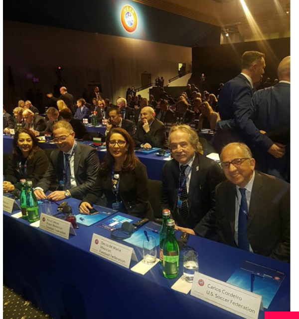 يحضر في هذه الأثناء فوزي لقجع رئيس الجامعة الملكية المغربية لكرة القدم، رفقة نوال المتوكل، ورئيس الاتحاد الافريقي لكرة القدم، أحمد أحمد، أشغال المؤتمر الـ42 للاتحاد الأوروبي لكرة القدم « ويفا » المقام بالعاصمة السلوفاكية براتيسلافا،والترويج لملف ترشح المغرب لتنظيم نهائيات كأس العالم 2026.