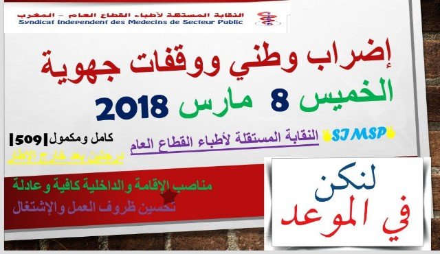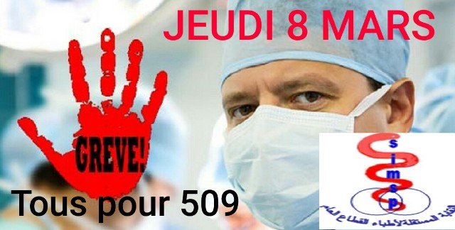 سيجد مئات الآلاف من المواطنين المحتاجين للعلاج أنفسهم يوم الخميس 8 مارس2018 في مأزق حقيقي وذلك عقب إعلان النقابة المستقلة لأطباء القطاع العام عن عزمها الدخول في إضراب احتجاجا على الوضع المتأزم الذي وصل إليه القطاع الصحي ببلادنا والذي أصبح يستحيل معه تقديم خدمات صحية ذات جودة للمواطنين.