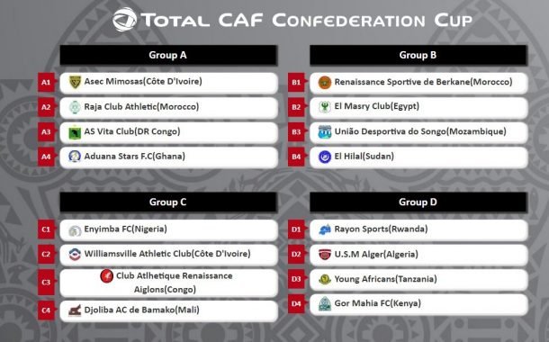وفي ما يلي نتيجة عملية سحب قرعة دور المجموعات لكأس الكونفدرالية الأفريقية لكرة القدم: