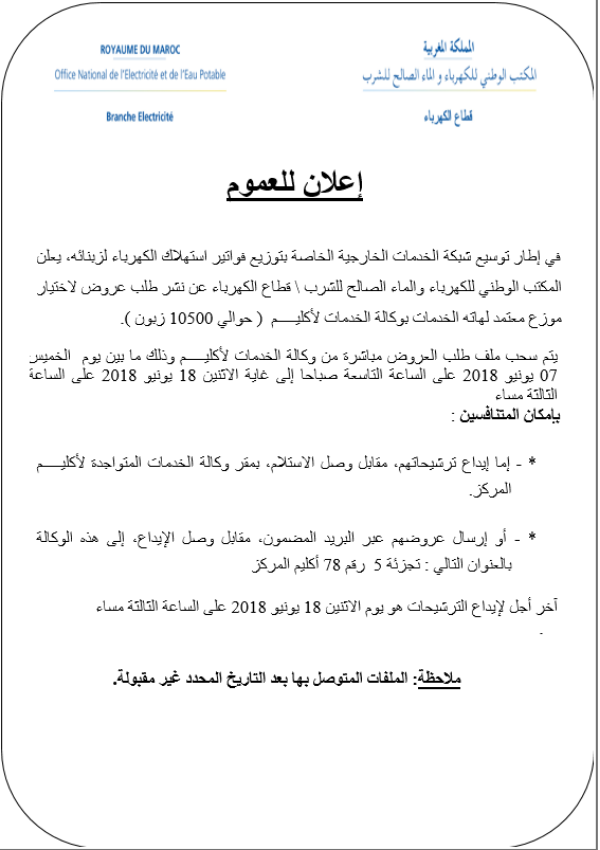 في إطار توسيع شبكة الخدمات الخارجية الخاصة بتوزيع فواتير استهلاك الكهرباء لزبنائه، يعلن المكتب الوطني للكهرباء والماء الصالح للشرب \ قطاع الكهرباء عن نشر طلب عروض لاختيار موزع معتمد لهاته الخدمات بوكالة الخدمات لأكليـــــم