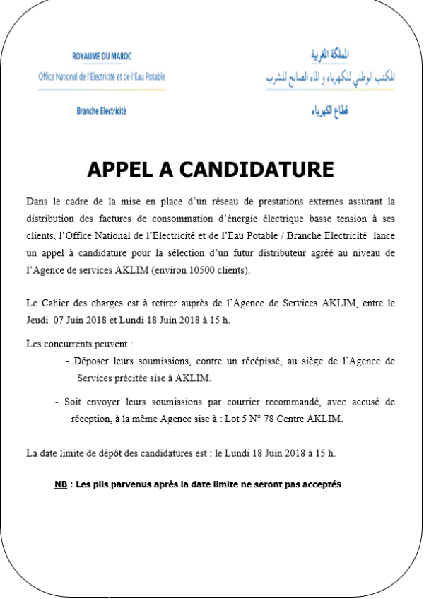 Dans le cadre de la mise en place d’un réseau de prestations externes assurant la distribution des factures de consommation d’énergie électrique basse tension à ses clients, l’Office National de l’Electricité et de l’Eau Potable / Branche Electricité lance un appel à candidature pour la sélection d’un futur distributeur agréé au niveau de l’Agence de services AKLIM (environ 10500 clients).