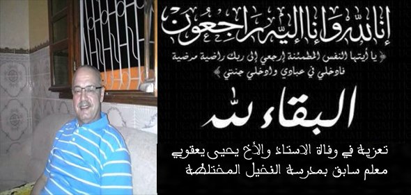 بعيون دامعة وقلوب خاشعة راضية بقضاء الله وقدره، تلقت جريدة صباح الشرق صباح اليوم الإثنين 12 نونبر 2018 نبأ وفاة الاستاذ والأخ يحيى يعقوبي كان يشتغ معلما سابقا بمدرسة النخيل المختلطة والذي توفي بعد اجرائه عملية على مستوى القلب.