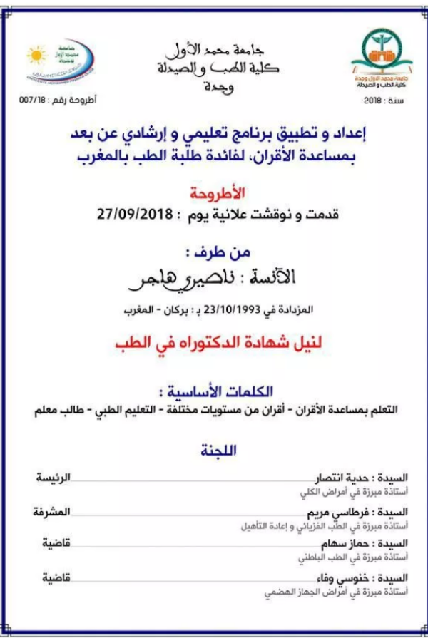 عرف المدرج الرئيسي لكلية طب والصيدلة بجامعة محمد الأول بوجدة مناقشة أطروحة لنيل دبلوم الدكتوراه تحت عنوان “إعداد وتطبيق برنامج تعليمي وإرشادي عن بعد بمساعدة الأقران، لفائدة طلبة الطب”، من إعداد الدكتورة نصيري هاجر.