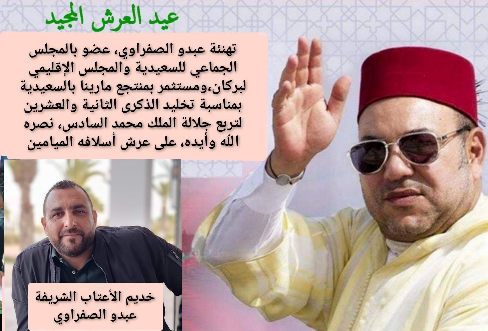 يتشرف خديم الأعتاب الشريفة، عبدالمالك الصفراوي،عضو بالمجلس الجماعي للسعيدية والمجلس الإقليمي لبركان،ومستثمر بمنتجع مارينا بالسعيدية،