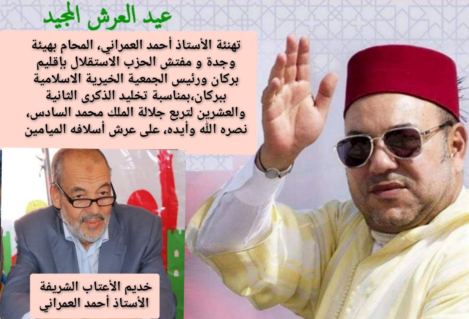 يتشرف خديم الأعتاب الشريفة،الأستاذ أحمد العمراني، المحام بهيئة وجدة و مفتش الحزب الاستقلال بإقليم بركان ورئيس الجمعية الخيرية الاسلامية ببركان، بأن يتقدم بأزكى عبارات التهاني والتبريك، وأسمى آيات الولاء والإخلاص إلى السدة العالي بالله