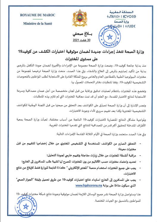 كما ستفرض الوزارة على جميع المختبرات استخدام منصة “المختبر الإلكتروني E-Labs” التابعة للوزارة فقط للإبلاغ عن نتائج الاختبارات، كما سيكون على المسافرين إلى الخارج أن يستردوا نتائج اختبارات كوفيد-19 عن طريق تحميل وثيقة “الجواز الصحي” الذي سيكون متاحًا على بوابة www.liqahcorona.ma.