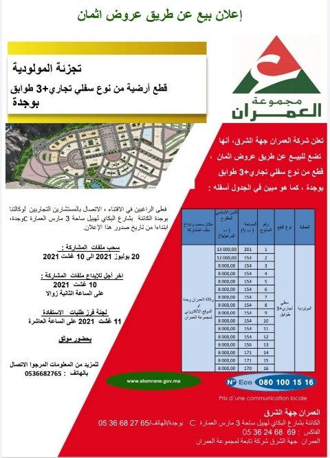 تعلن شركة العمران جهة الشرق، أنها تضع للبيع عن طريق عروض أثمان/ تجزئة المولودية قطع أرضية من نوع سفلي تجاري+3 طوابق بوجدة