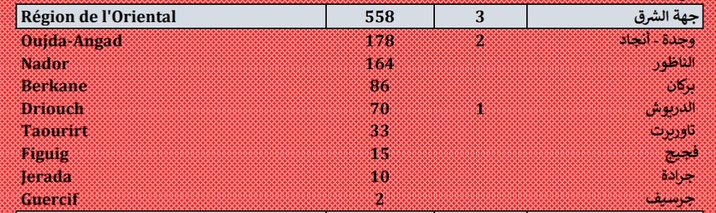أما بخصوص تقسيم الحالات 558 المسجلة بالجهة الشرقية لهذا اليوم، فجاءت على الشكل التالي: