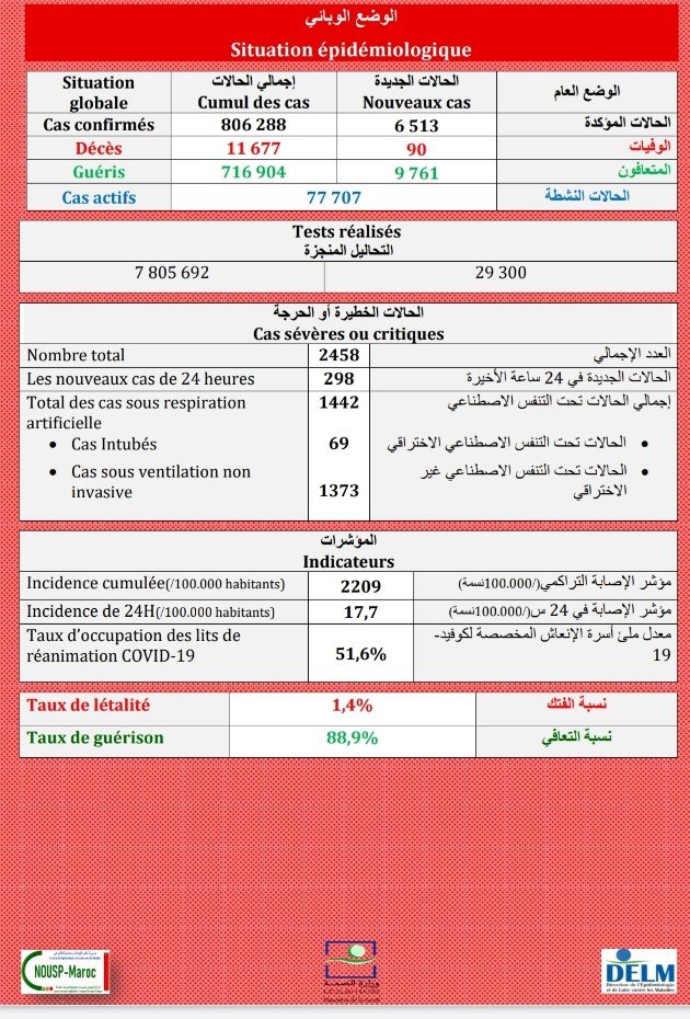 كشفت وزارة الصحة، اليوم السبت 21 غشت 2021، تسجيل 6513 إصابة مؤكدة بفيروس “كورونا”و90 حالة وفاة جديدة، خلال ال24 ساعة الماضية،وكان نصيب الجهة الشرقية منها 754 حالة جديدة مع تسجيل 15 حالة وفاة.