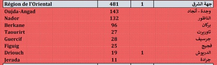 أما بخصوص تقسيم الحالات 481 المسجلة بالجهة الشرقية لهذا اليوم، فجاءت على الشكل التالي: