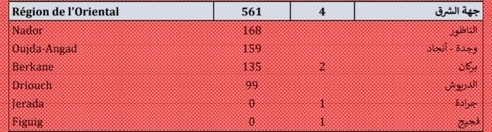أما بخصوص تقسيم الحالات 561 المسجلة بالجهة الشرقية لهذا اليوم، فجاءت على الشكل التالي: