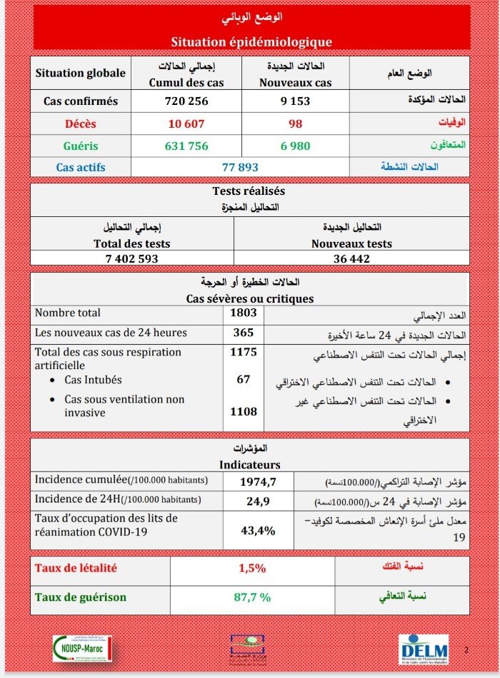 أعلنت وزارة الصحة المغربية، مساء اليوم الأربعاء 11 غشت2021، عن تسجيل 9153 حالة جديدة و98 وفاة” منها 561 بالجهة الشرقية.