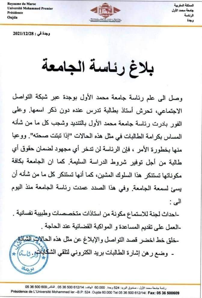 الطالبة الضحية، اضطرت إلى مغادرة المدرسة الوطنية للتسيير والتجارة بوجدة نتيجة حسب تصريحها لممارسات مشينة عبر محادثات خاصة من أحد الأساتذة لاستغلالها جنسيا، مقابل حصولها على نقاط ممتازة مما جعلها تغادر المدرسة وتقرر الخروج عن صمتها في النازلة.