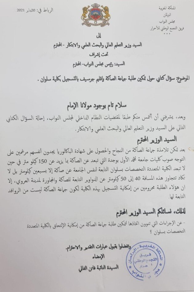 والسؤال الثاني موجه إلى وزير التعليم العالي والبحث العلمي والابتكار،حول تمكين طلبة جماعة الصاكة بإقليم جرسيف بالتسجيل بكلية سلوان .
