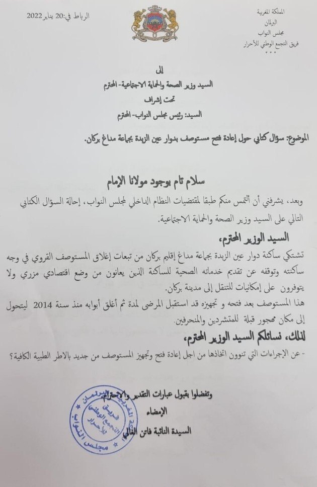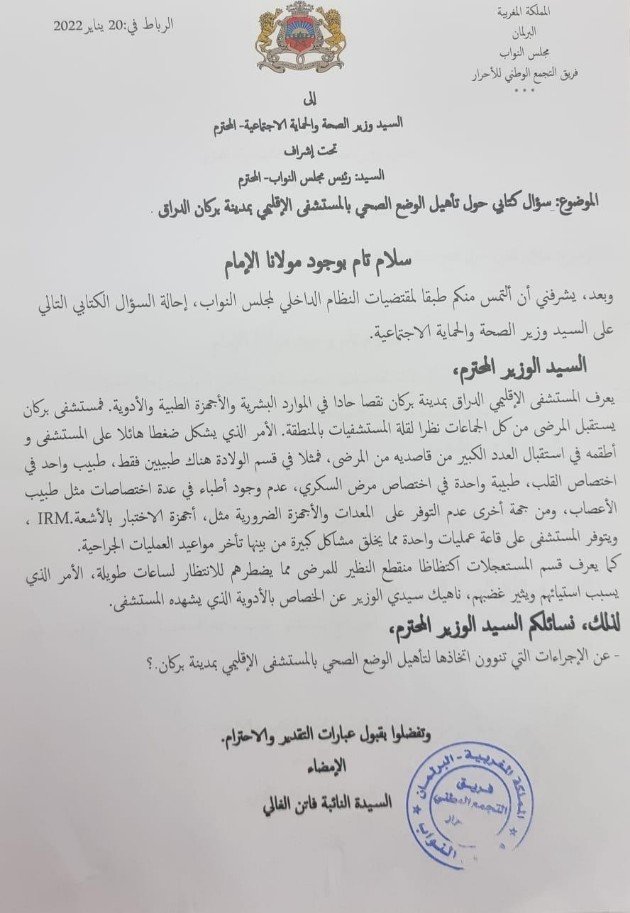 الأعصاب،ومن جهة أخرى عدم توفر المستشفى الاقليمي على المعدات والأجهزة الضرورية مثل، أجهزة الاختبار بالأشعة(IRM)،كما لايتوفر المستشفى إلا على قاعة عمليات واحدة مما يخلق مشاكل كبيرة من بينها تأخر مواعيد العمليات الجراحية،كما يعرف قسم المستعجلات اكتظاظا منقطع النظير للمرضى مما يضطرهم للانتظار لساعات طويلة، الأمر الذي يسبب استيائهم ويثير غضبهم،وفي نفس السياق وجهت النائبة البرلمانية عن جهة الشرق سؤالين كتابين آخرين يتعلقان بقطاع الصحة،للوزير آيت الطالب،الأول حول إعادة فتح مستوصف دوار عين الزبدة بجماعة مداغ بركان والثاني حول فتح مستشفى القرب بمدينة السعيدية وتأهيله،حيث تعيش مدينة السعيدية في الآونة الأخيرة مجموعة من المشاكل بخصوص الوضع الصحي بعد غلق مستشفى القرب في وجه المرضى، حيث تم تخصيص هذا المستشفى لمرضى كورونا، مما جعله يعيش عدة مشاكل بعد استنزاف أطره الصحية وتجريده من غالبية معداته البيوطبية.