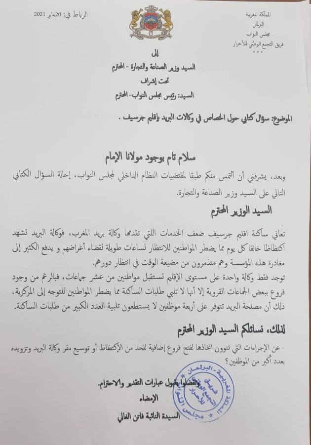 ولم تنس البرلمانية فاتن غالي المشاكل التي تتخبط فيها مدينة جرسيف،حيث نالت حصتها من الأسئلة الكتابية من خلال سؤالين كتابين واحد موجه إلى وزير الصناعة والتجارة تمحور حول الخصاص في وكالات البريد بإقليم جرسيف، حيث يعاني ساكنةالإقليم من ضعف الخدمات التي تقدمها وكالة بريد المغرب،التي تشهد