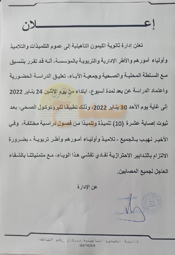 أعلنت إدارة ثانوية الليمون التأهيلية بمدينة بركان ، بناء على مخرجات الاجتماع المنعقد يوم الإثنين 24 يناير 2022 ، عن تعليق الدراسة الحضورية بالمؤسسة واعتماد الدراسة عن بعد لمدة اسبوع، ابتداء من يوم الإثنين 24 يناير 2022 إلى غاية يوم الأحد 30 يناير 2022 وذلك تطبيقا للبرتوكول الصحي.