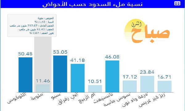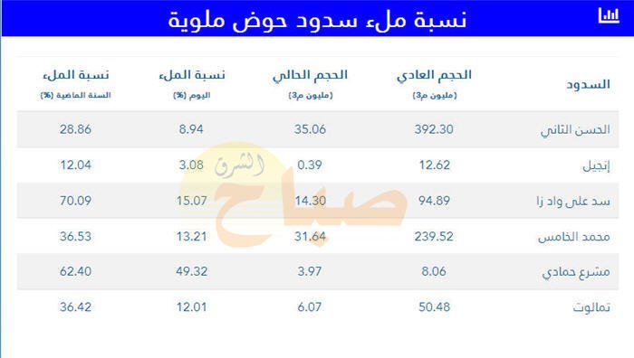 وفي سد الحسن الثاني ، وصل معدل الملء 8.94 في المائة ( 35.06 مليون متر مكعب)، في ما بلغت هذه النسبة في سد على واد زا 15.07 في المائة بما يعادل 14.30 مليون متر مكعب.