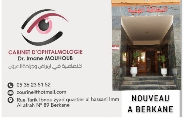افتتحت مؤخرا بمدينة بركان ، عيادة خاصة لطب و جراحة العيون،أبوابها في وجه العموم، بتجهيزات حديثة وتوفر كافة شروط الراحة في مجال علاج و جراحة المياه البيضاء (الجلالة) وتصوير أوعية الشبكة والليزر.