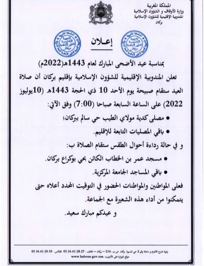 أعلنت المندوبية الإقليمية للشؤون الإسلامية بإقليم بركان،أن صلاة عيد الأضحى المبارك لعام ذي الحجة 1443 هـ الموافق 10 يوليوز 2022.