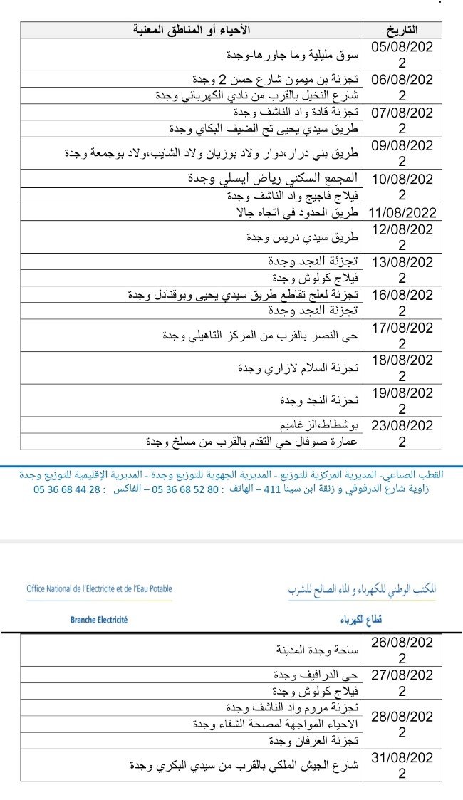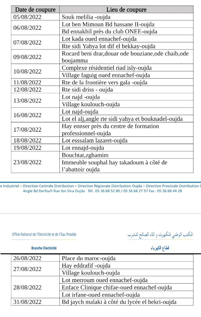 L’Office National de l’Electricité et de l’Eau potable – Branche Electricité – porte à la connaissance de l’ensemble de ses clients qu’en raison des travaux de maintenance de son réseau électrique, des coupures de courant seront programmées courant le mois de AOÛT/2022, au niveau des zones et des quartiers selon le calendrier ci-dessous, et ce à partir de 08h00 jusqu’à 14h00.