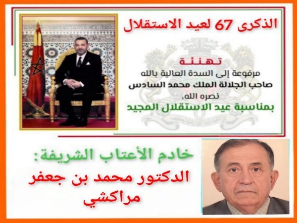 بمناسبة الذكرى 67 لعيد الاستقلال المجيد، يتقدم السيد الدكتور محمد بن جعفر مراكشي، بأصدق عبارات التهاني و أسمى الأماني، إلى السدة العالية بالله صاحب الجلالة الملك محمد السادس نصره الله، مجددا لجلالته تعلقه بأهداب العرش العلوي المجيد سائلا الله تعالى أن يبقي ملكنا الهمام ذخرا وملاذا لشعبه الوفي، ضامنا لعزة الوطن واستقراره، وأن يقر عينيه بولي عهده صاحب السمو الملكي الأمير الجليل مولاي الحسن، وصاحبة السمو الملكي الأميرة الجليلة لالة خديجة، وأن يشد أزره بشقيقه صاحب السمو الملكي الأمير الجليل مولاي رشيد، وبسائر أفراد الأسرة الملكية الشريفة، إنه سميع مجيب الدعاء.