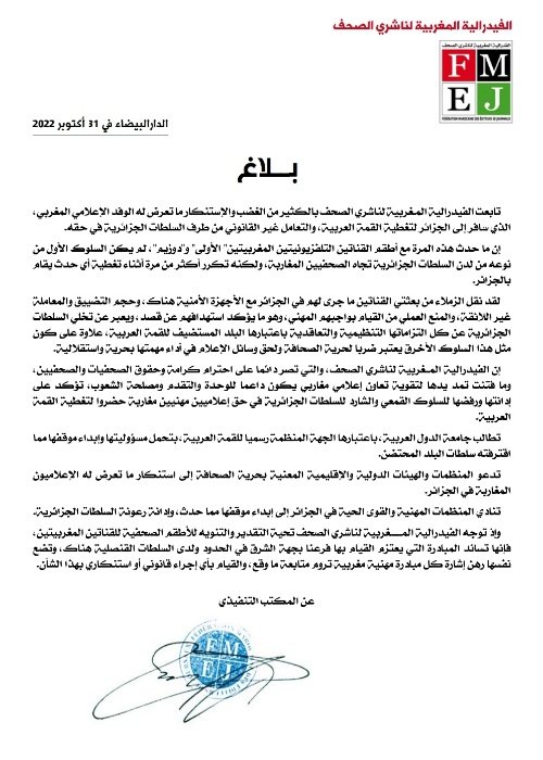 أعربت الفيدرالية المغربية لناشري الصحف ،يوم الإثنين31 أكتوبر 2022، عن إدانتها ورفضها “للسلوك القمعي والشارد” للسلطات الجزائرية في حق الوفد الإعلامي المغربي الذي سافر إلى الجزائر لتغطية القمة العربية.
