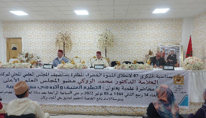 في إطار الأنشطة العلمية التي ينظمها المجلس العلمي المحلي ببركان، وبمناسبة الاحتفال بذكرى المسيرة الخضراء، ألقى الدكتور العلامة محمد الروكي عضو المجلس العلمي الأعلى،يوم الأربعاء 14 ربيع الثاني 1444 هـ الموافق 09 نونبر 2022 م، على الساعة الرابعة عصرا، محاضرة تحت عنوان:”التعليم العتيق وأثره في حفظ الهوية” وذلك بقاعة المحاضرات بمدرسة الإمام نافع للتعليم العتيق بحي المجد ببركان .