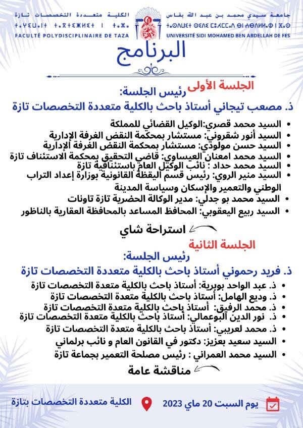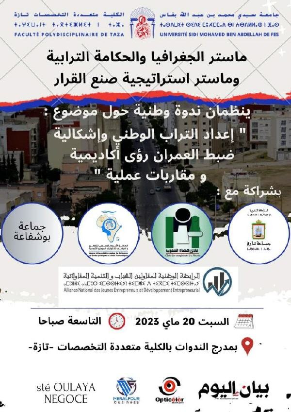 تنظم جامعة سيدي محمد بن عبد الله-الكلية متعددة التخصصات بتازة(ماستر الجغرافيا والحكامة الترابية، وماستر استراتيجية صنع القرار)، وبشراكة مع فعاليات متنوعة، سياسية، وقضائية، وعلمية، وتقنية… يوم السبت 20 ماي برحاب الكلية (مدرج الندوات)، ابتداء من الساعة التاسعة صباحا، ندوة علمية في موضوع :