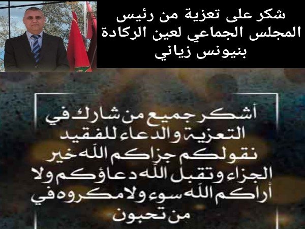 يتقدم السيد بنيونس زياني، رئيس المجلس الجماعي لعين الركادة، أصالة عن نفسه ونيابة عن كافة أسرة زياني، بجزيل الشكر والامتنان والتقدير والعرفان لكل من قدم له التعزية الصادقة والمواساة الحسنة في وفاة والدته، تغمدها الله برحمته الواسعة والتي وافتها المنية يوم الأحد 21 ماي 2023، كما يشكر كل من قدم له واجب العزاء سواء بالحضور والمشاركة في مراسم الدفن أو بصادق الشعور من خلال الإتصال الهاتفي من داخل المغرب ومن خارجها.