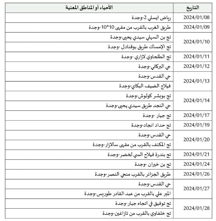 ينهي المكتب الوطني للكهرباء والماء الصالح للشرب –قطاع الكهرباء- إلى علم زبنائه الكرام أنه نظرا لأشغال الصيانة التي ستباشرها وحداتها على الشبكة الكهربائية خلال شهر يناير 2024، سيتم قطع التيار الكهربائي على مستوى الأحياء والمناطق حسب الجدولة الزمنية المبينة أسفله وذلك ابتداء من الساعة الثامنة صباحا (00 :08) إلى غاية الساعة الثانية بعد الزوال (00 :14).