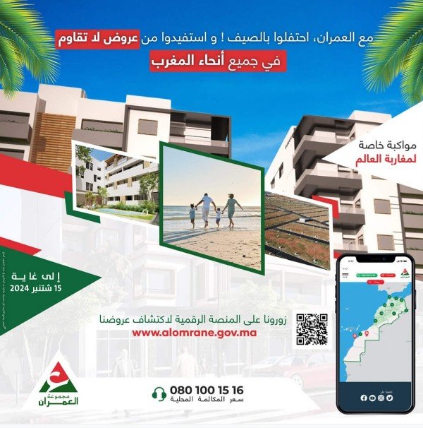 تعلن شركة العمران، أنها أطلقت عروضا استثنائية لمغاربة العالم مع صيف العمران، احتفلوا بالصيف واستفيدوا من عروض لا تقاوم في جميع أنحاء المغرب، إلى غاية 15 شتنبر 2024.