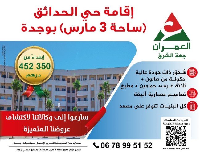 تعلن شركة العمران جهة الشرق عن عروضها المتميزة ببيع شقق ذات جودة عالية وبتصاميم معمارية متميزة ابتداء من 452350 درهم، بإقامة حي الحدائق (ساحة 3 مارس) بوجدة، وتحتوي على خدمة المصعد وتتكون كل شقة من: