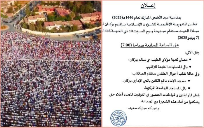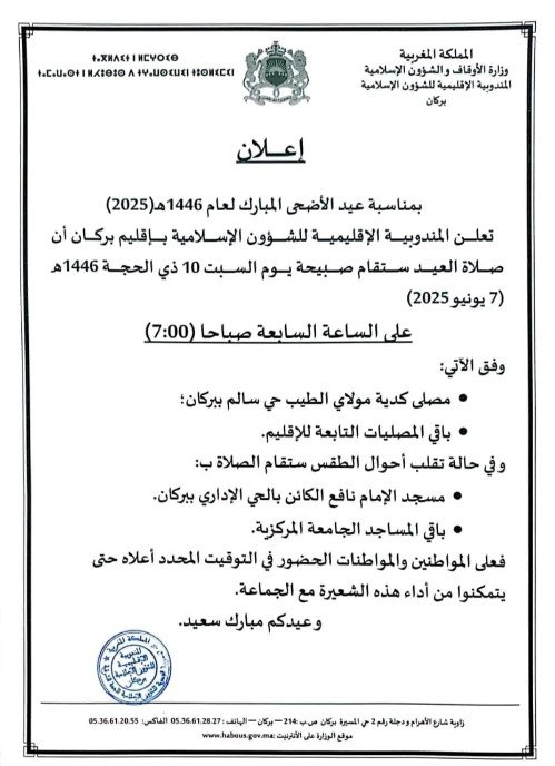 كما أشار الإعلان إلى أنه في حالة سوء الأحوال الجوية، ستُقام صلاة العيد داخل مسجد الإمام نافع بالحي الإداري ببركان، وباقي المساجد الجامعة المركزية.