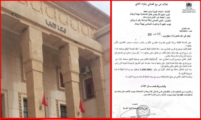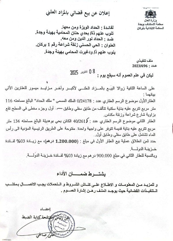 إعلان عن بيع للعقارين بالمزاد العلني بالمحكمة الابتدائية ببركان، يوم الأربعاء 08 أكتوبر 2025 على الساعة الثانية زوالا.