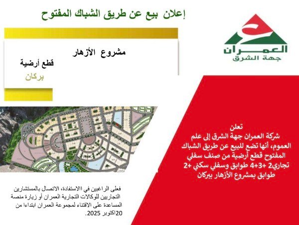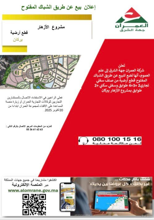 تُعلن شركة العمران – جهة الشرق إلى علم العموم، عن فتح باب البيع عن طريق الشباك المفتوح لعدد من القطع الأرضية المتوفرة ضمن مشروع الأزهار بمدينة بركان.