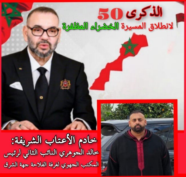 بمناسبة تخليد الشعب المغربي قاطبة للذكرى الخمسين لانطلاق المسيرة الخضراء المظفرة، التي تتزامن هذه السنة مع اعتماد القرار الأممي الصادر عن مجلس الأمن بشأن الصحراء المغربية، والذي يجدد تأكيد دعم المجتمع الدولي لمبادرة الحكم الذاتي تحت السيادة المغربية، يتشرف السيد خالد الجوهري، النائب الثاني لرئيسالمكتب الجهوي للغرفة الفلاحية جهة الشرق، أصالة عن نفسه ونيابة عن كافةالأعضاء والموظفين بالغرفة الفلاحية، بأن يرفع إلى المقام السامي لصاحب الجلالة الملك محمد السادس نصره الله وأيده، أسمى آيات التهاني والتبريك، مشفوعة بخالص معاني الولاء والإخلاص.